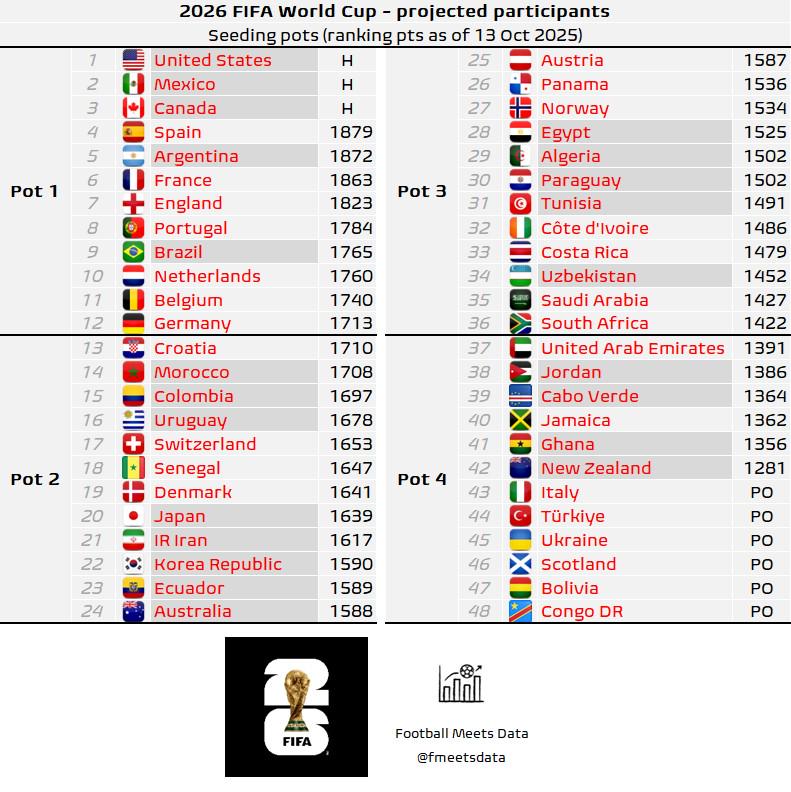 世界杯分档预测:传统强队均进入一档,意大利四档,日韩二档